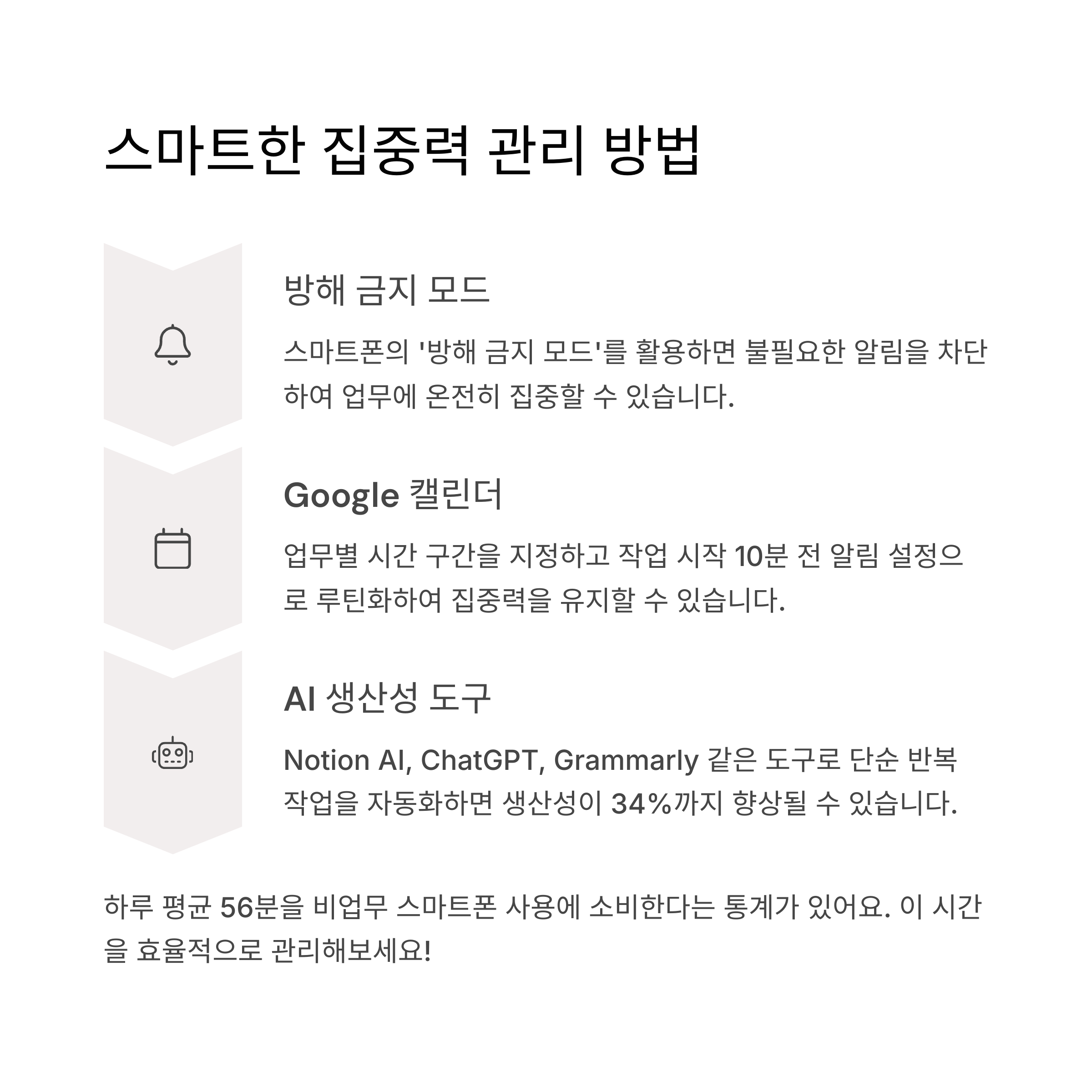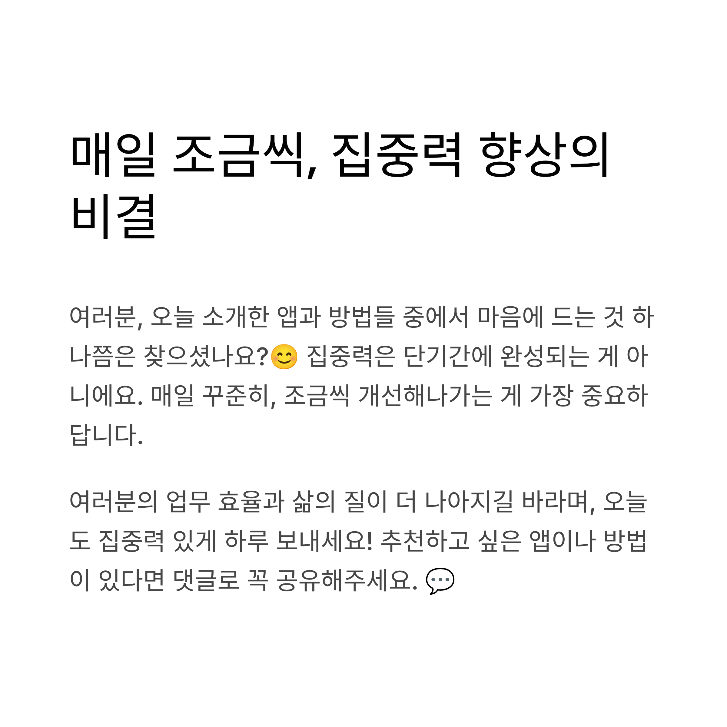 여러분의 업무 효율과 삶의 질이 더 나아지길 바라며, 오늘도 집중력 있게 하루 보내세요! 추천하고 싶은 앱이나 방법이 있다면 댓글로 꼭 공유해주세요. 💬