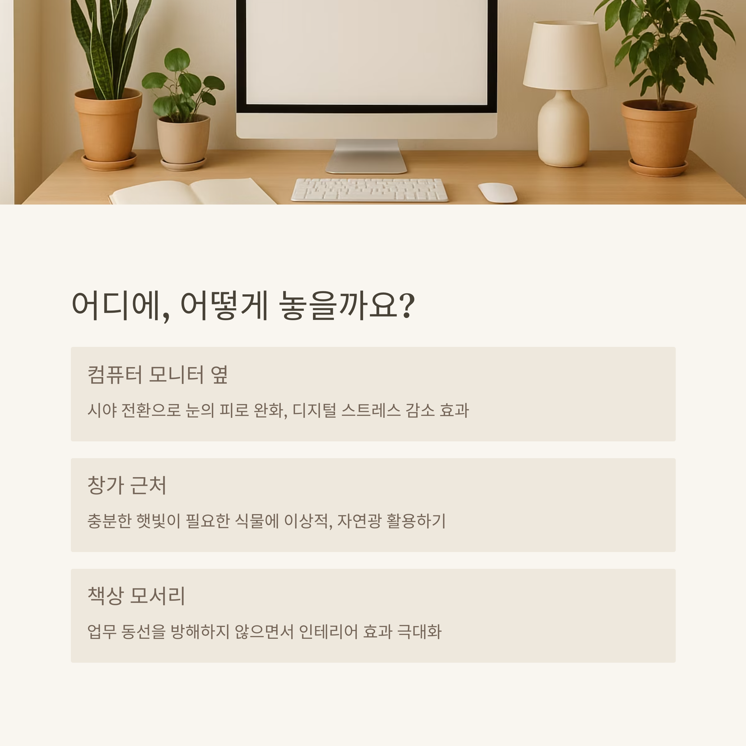 식물은 빛을 좋아하니 창가 근처에 두는 게 좋아요. 하지만 직사광선은 피해야 해요. 조도 센서나 스탠드 조명 근처에 두는 것도 하나의 방법이죠. 너무 큰 식물보단, 한 손에 들어오는 아담한 크기의 식물이 책상에 부담을 주지 않아서 좋답니다!