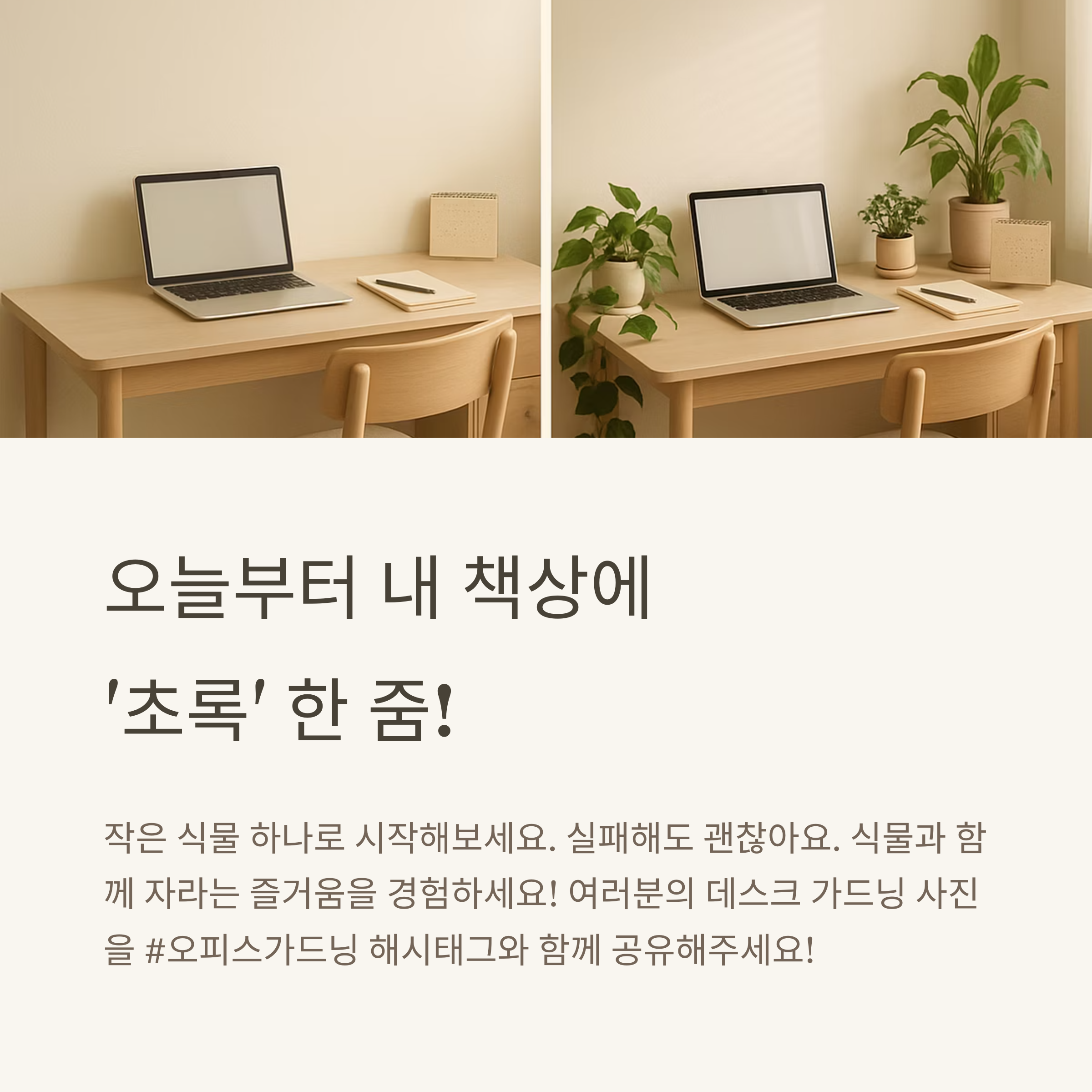 작은 변화 하나가 하루를 달라지게 해요. 오피스 데스크에 초록 식물 하나를 더해보는 것, 생각보다 훨씬 더 큰 행복을 가져다준답니다. 여러분도 이번 주에는 작은 초록 친구 하나 들여보세요! 여러분의 책상도, 하루하루도 싱그럽게 변화하길 응원할게요. 🌿