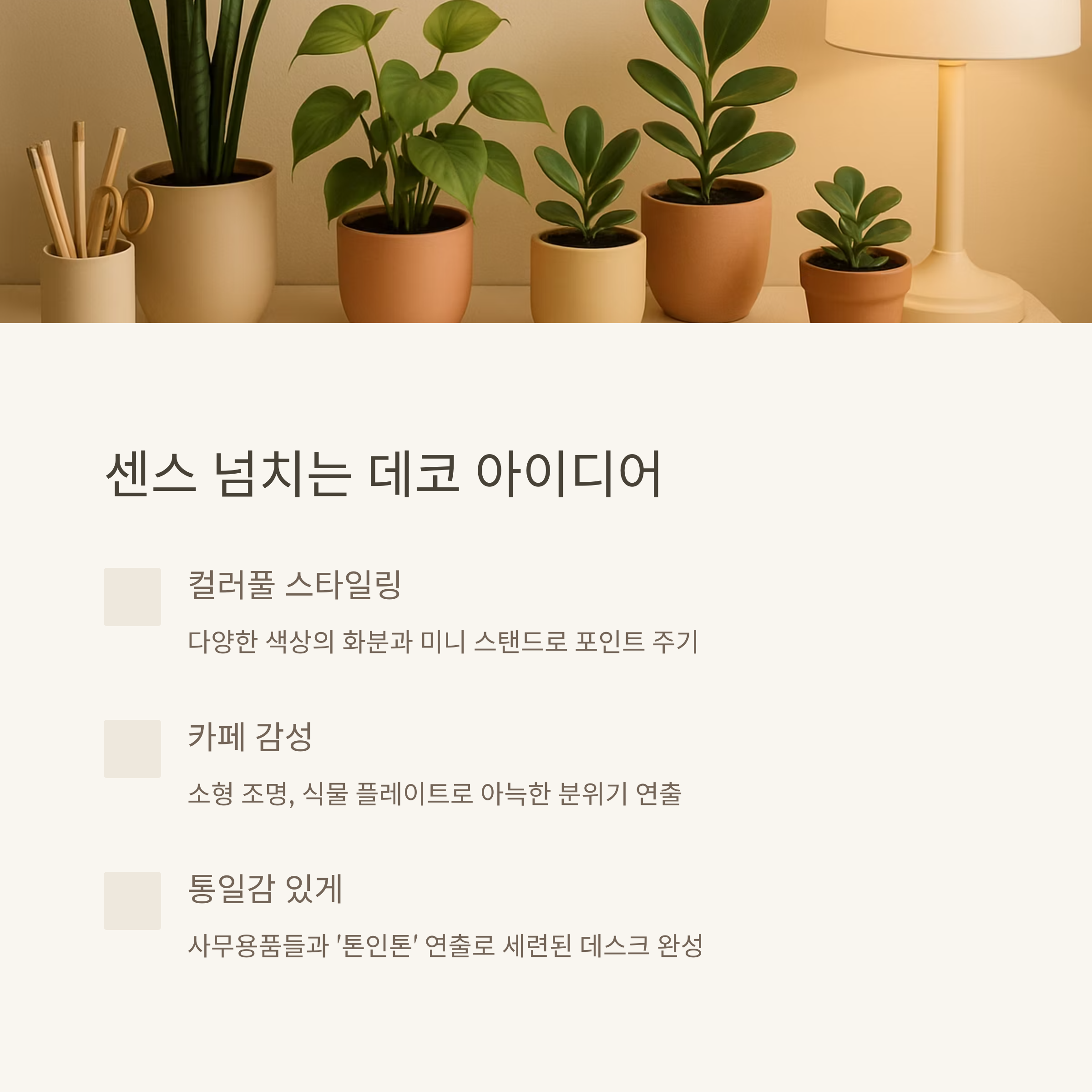 물을 너무 자주 주거나, 빛이 전혀 없는 곳에 식물을 두는 것은 금물! 그리고 한꺼번에 많은 식물을 들이기보다는, 하나둘 천천히 늘려가며 데스크에 어울리는 스타일을 찾아가는 게 좋아요.