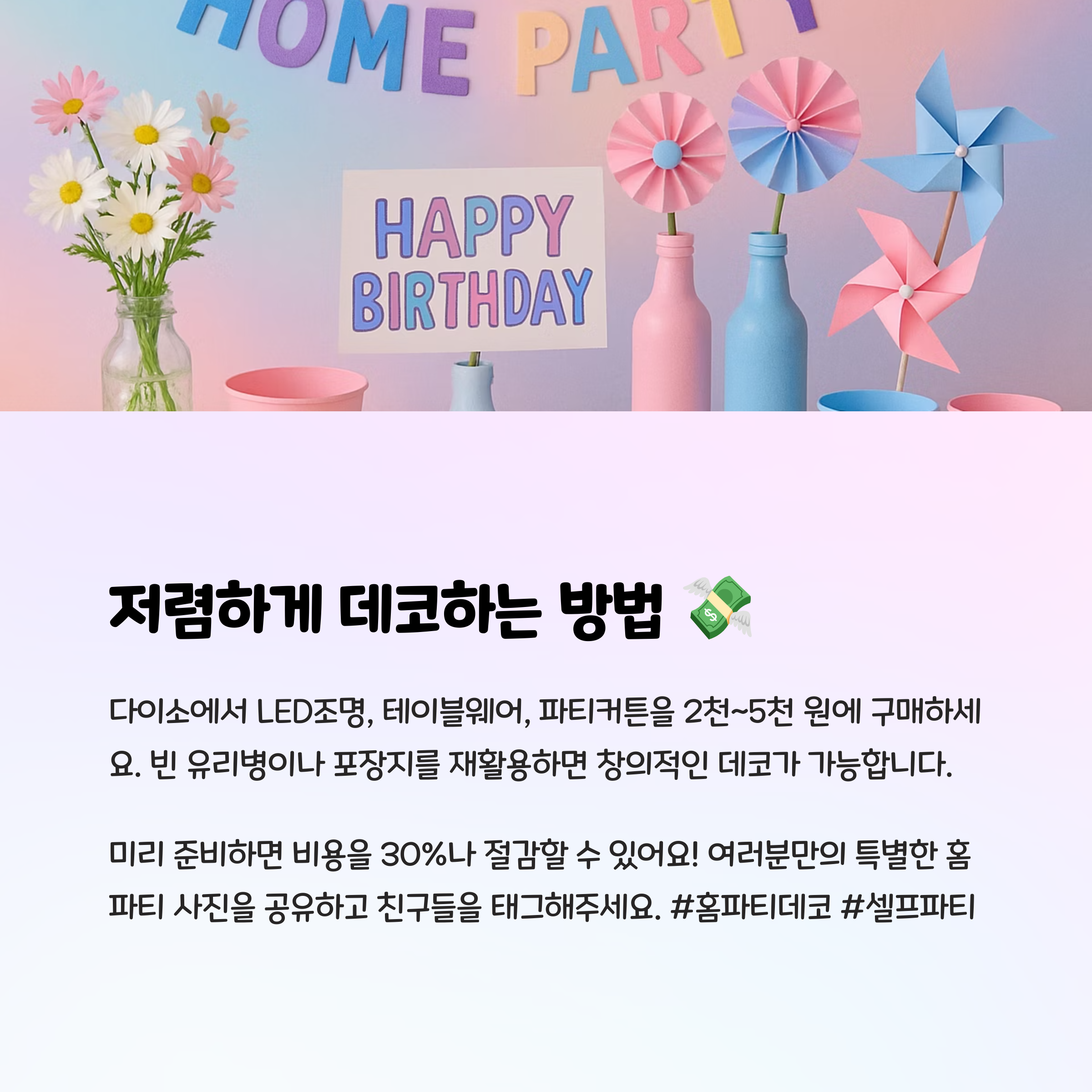 굳이 비싼 소품을 살 필요 없어요! 다이소, 알리익스프레스 같은 곳에서도 저렴하고 귀여운 데코 아이템을 많이 살 수 있답니다. 또, 친구들과 함께 직접 만드는 DIY 데코도 추천해요. 가성비 있게, 마음도 정성도 가득한 홈파티 완성!